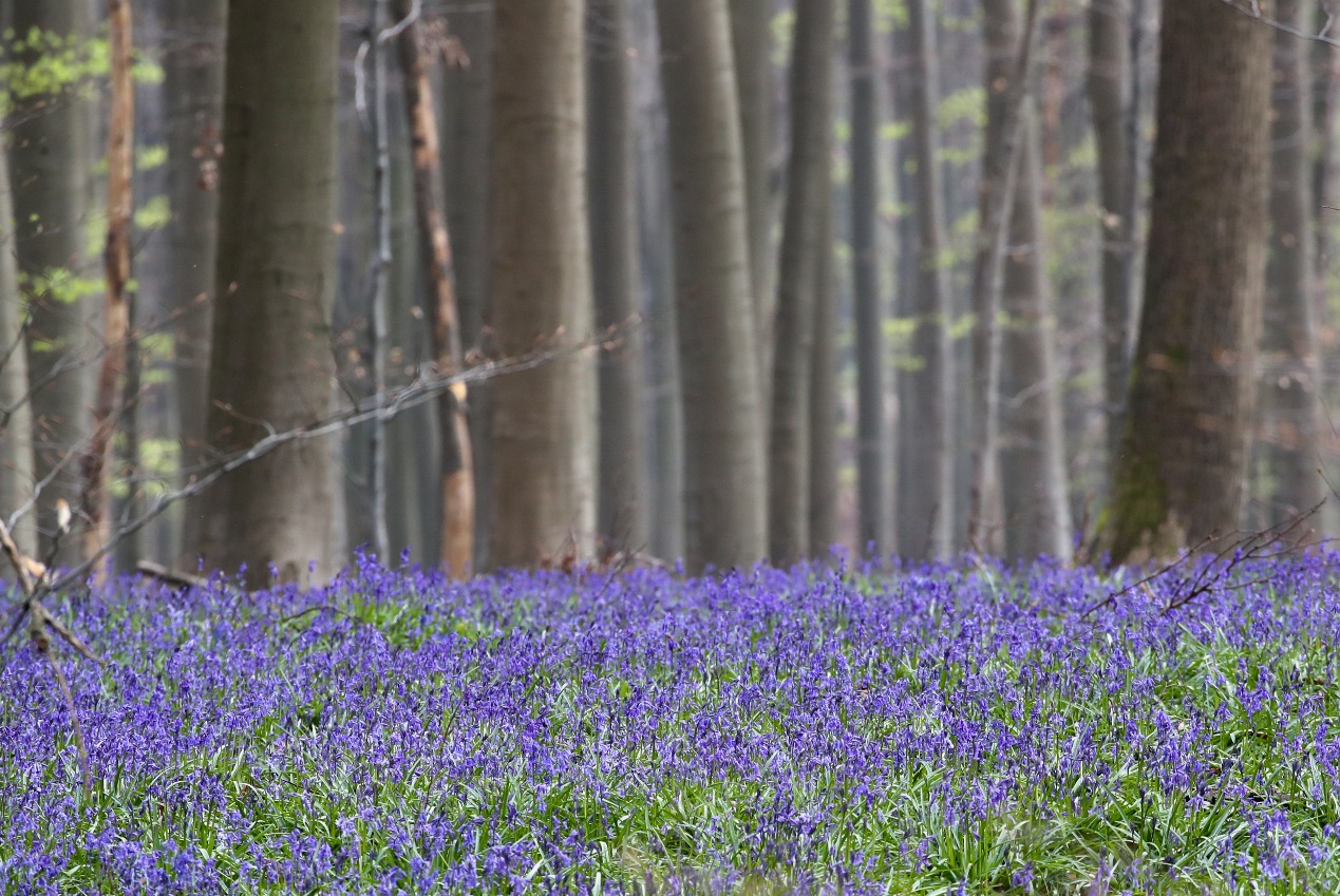 當地時間4月20日,在比利時哈勒,野生藍鈴花在4月中旬左右爭相盛開,在森林裏形成一片藍色的「地毯」。
