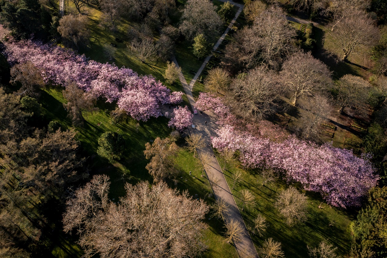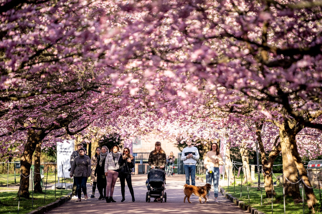 當地時間4月20日,在丹麥哥本哈根,人們行走在比斯佩布耶格公墓的櫻花巷中。