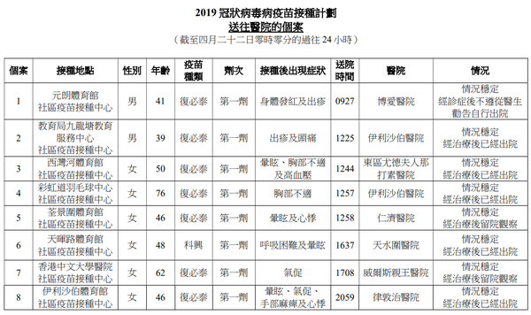 截至23日零時零分,過去24小時共有8宗送院個案,其中5人已經出院,2人留院觀察,1人不遵從醫生勸告自行出院。