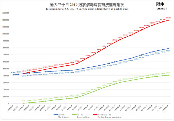 截至23日下午8時的過去24小時,約有23500名市民接種疫苗、當中3800人接種第一劑科興疫苗,當中約1600人在社區疫苗接種中心接種,約2300人是在參與計劃的私家醫生和診所接種;約有8000人接種第二劑科興疫苗,當中約5600人在社區疫苗接種中心接種,約2400人在私家醫生和診所接種;