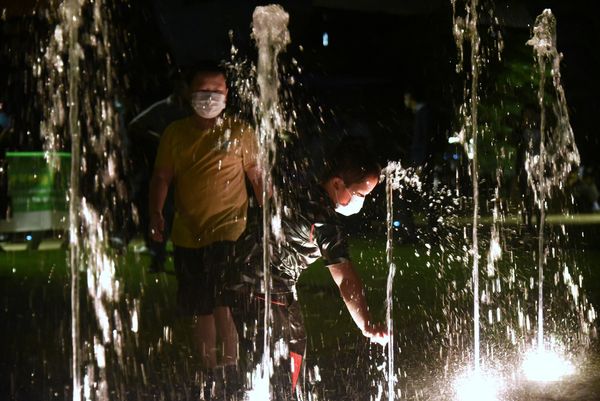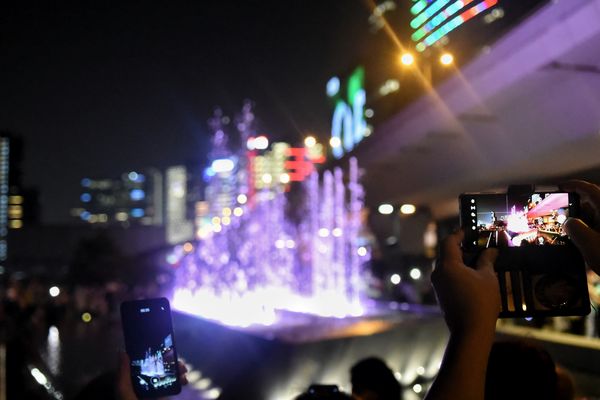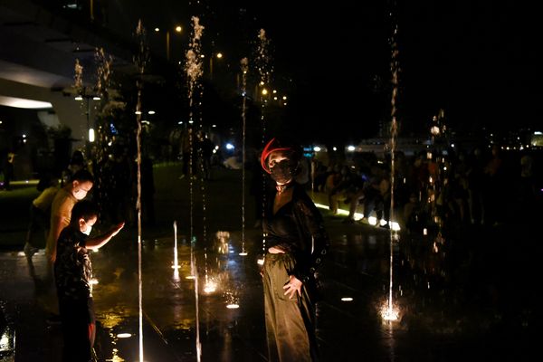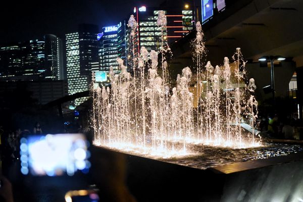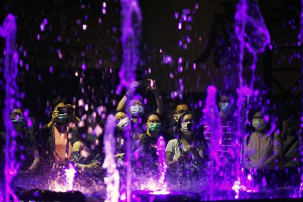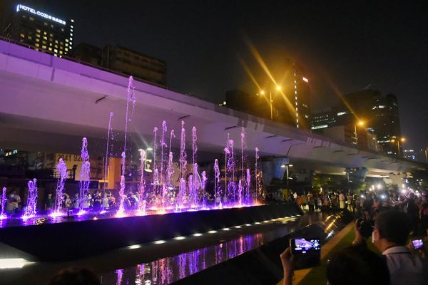 香港觀塘海濱音樂噴泉啟用,吸引了不少市民前來觀賞玩樂,享受浪漫溫馨一刻。觀塘海濱音樂噴泉項目耗資逾五千萬元,佔地約3740平方米,包括音樂噴泉、互動嬉水區及休憩草地。圖為市民4月22日晚到觀塘海濱音樂噴泉欣賞。