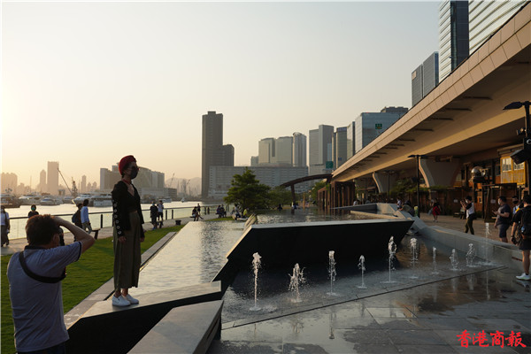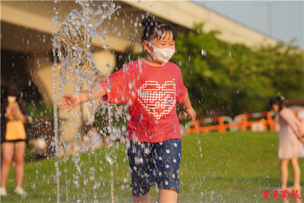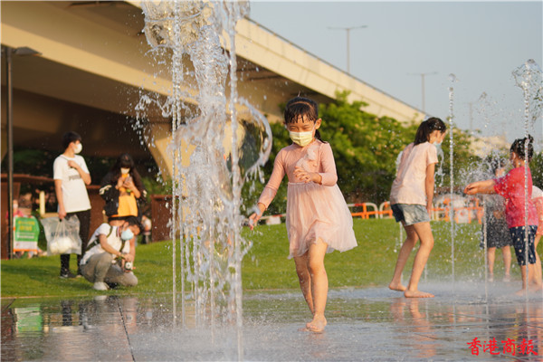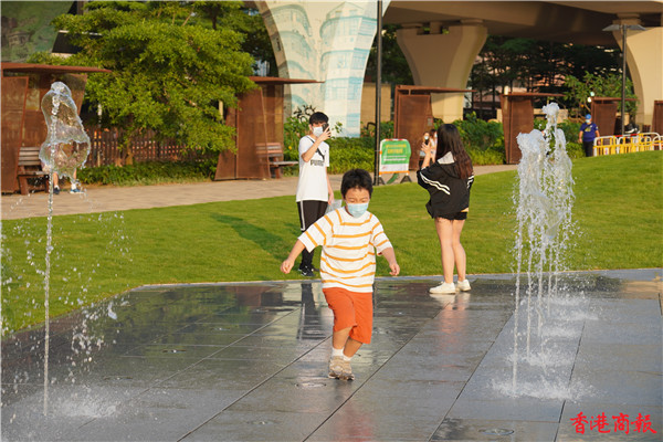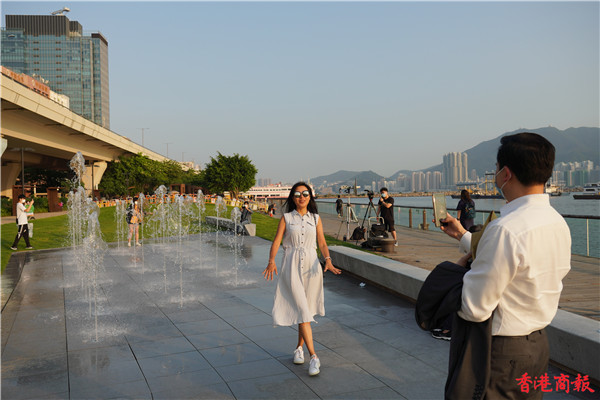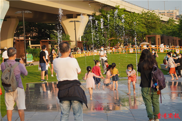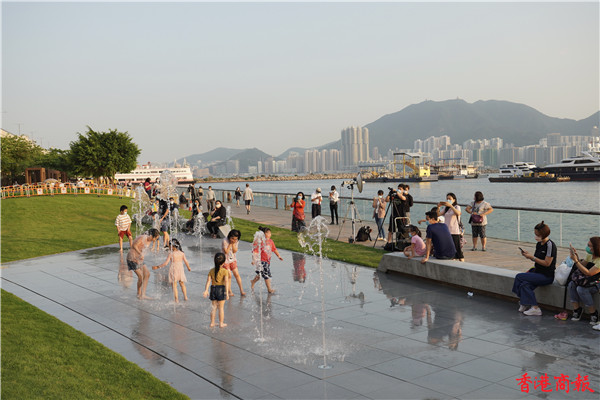 觀塘區議會社區重點項目計劃,佔地約3700平方米,耗資逾5000萬元建造的觀塘海濱音樂噴泉正式啟用。音樂噴泉以電腦程式控制水柱,水柱會配合名曲旋律舞動,吸引不少市民前來打卡。音樂噴泉項目共有3個互動嬉水區,各嬉水區內設有感應裝置,當感應到遊人接近時,不同噴咀會噴出形態各異的水柱。(馮俊文攝)