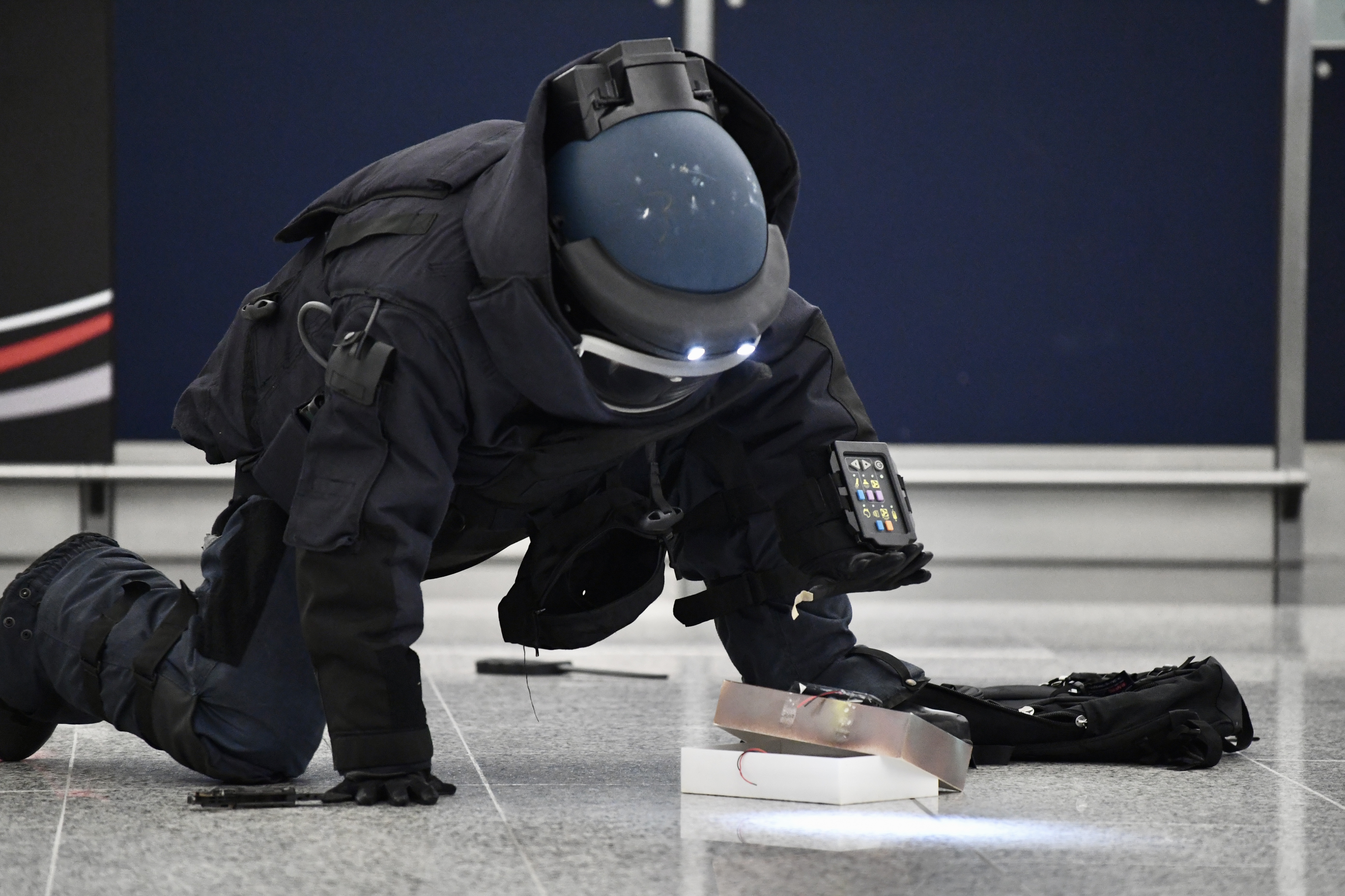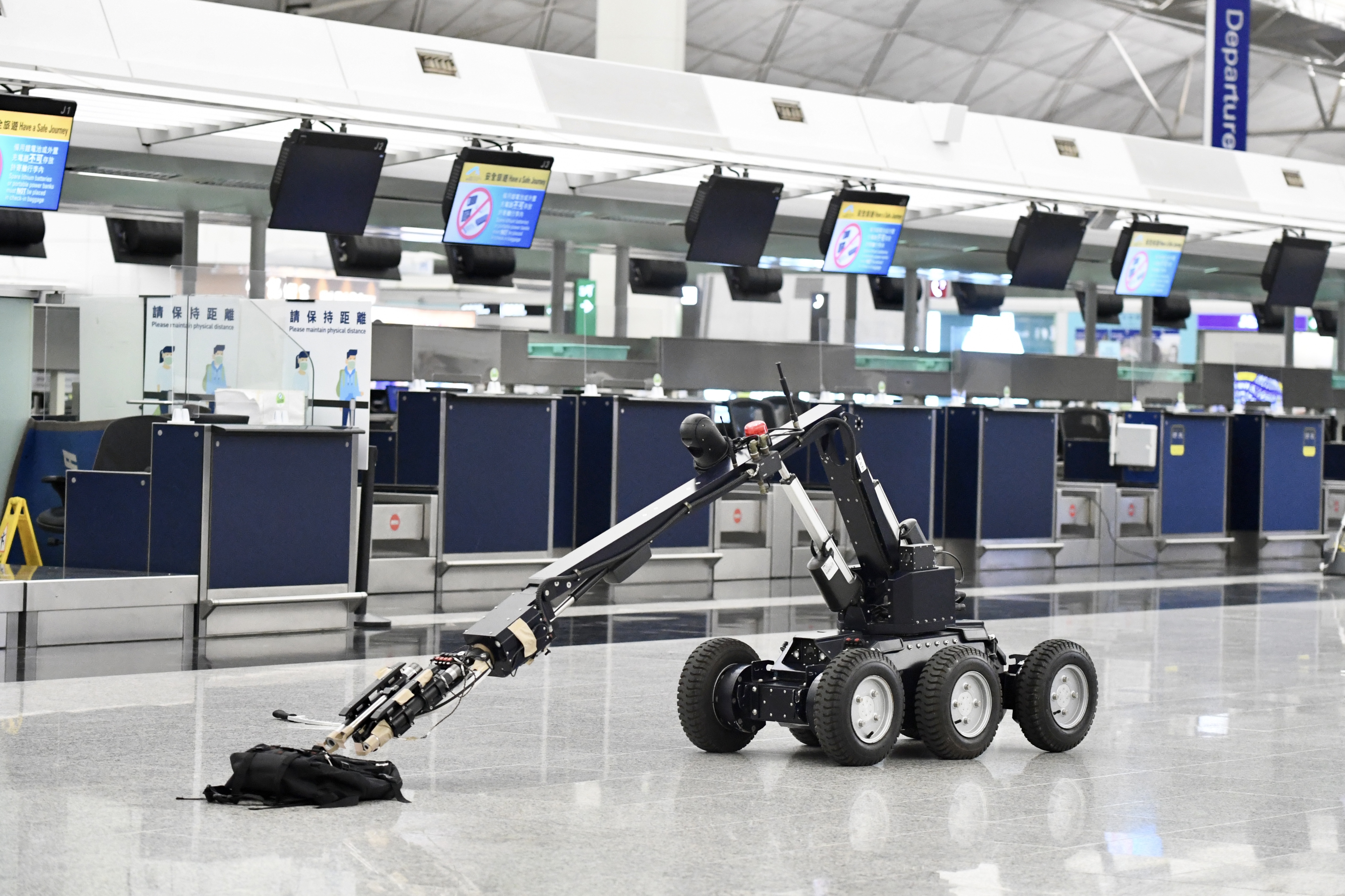 演習模擬客運大樓內發生一宗可疑物品案,警方爆炸品處理課接報到場,並運用機械長臂處理爆炸裝置。 圖:中通社