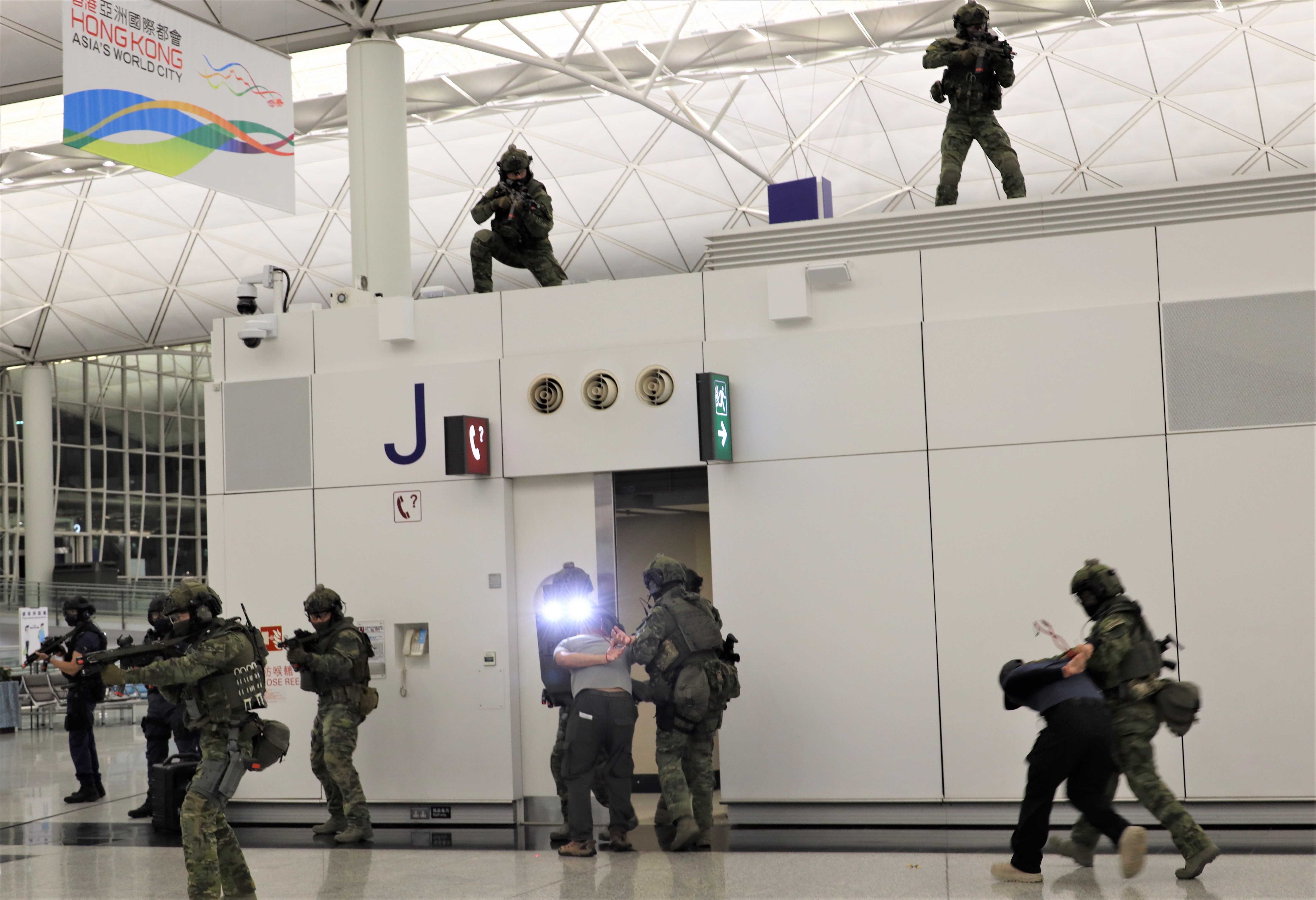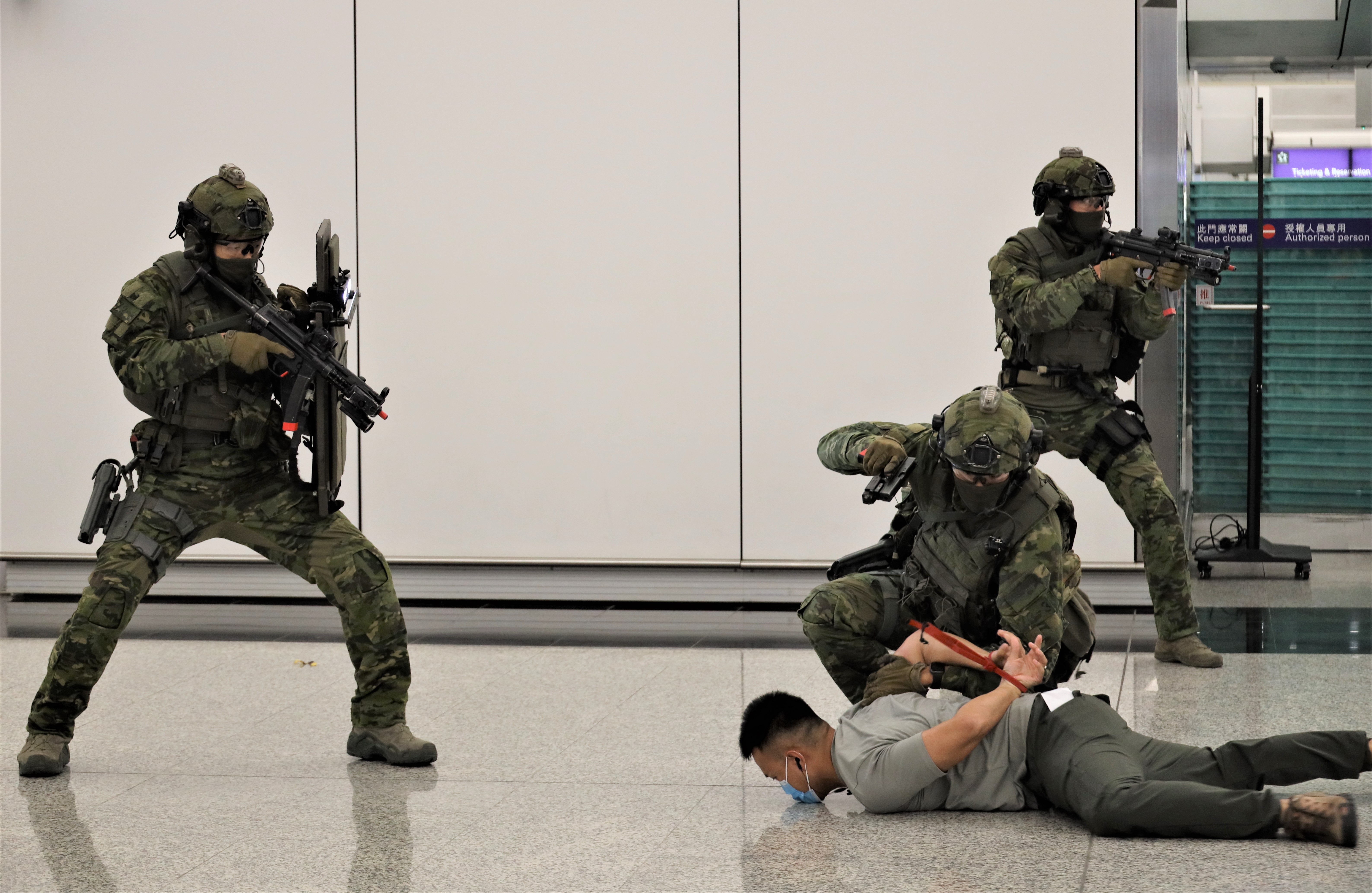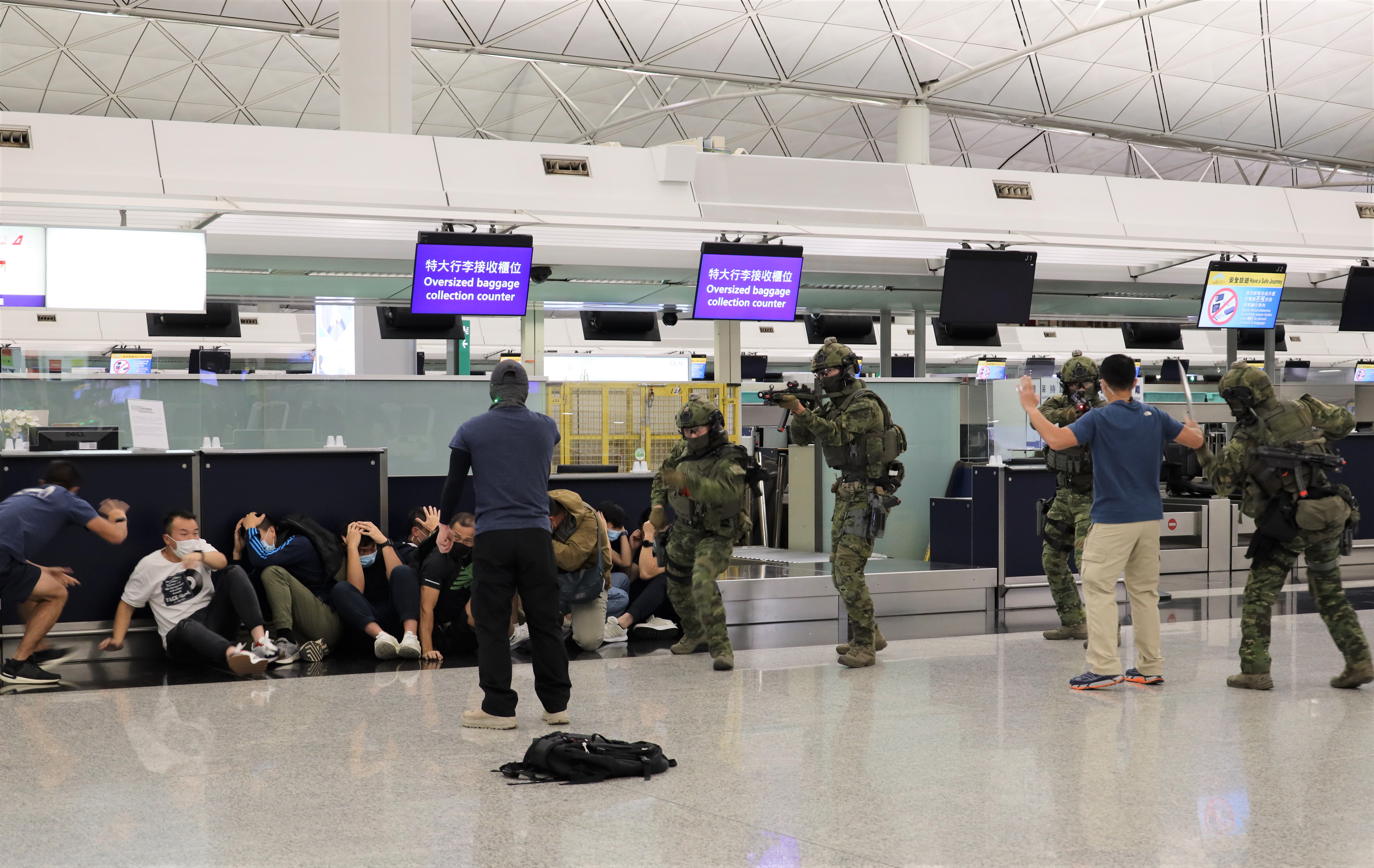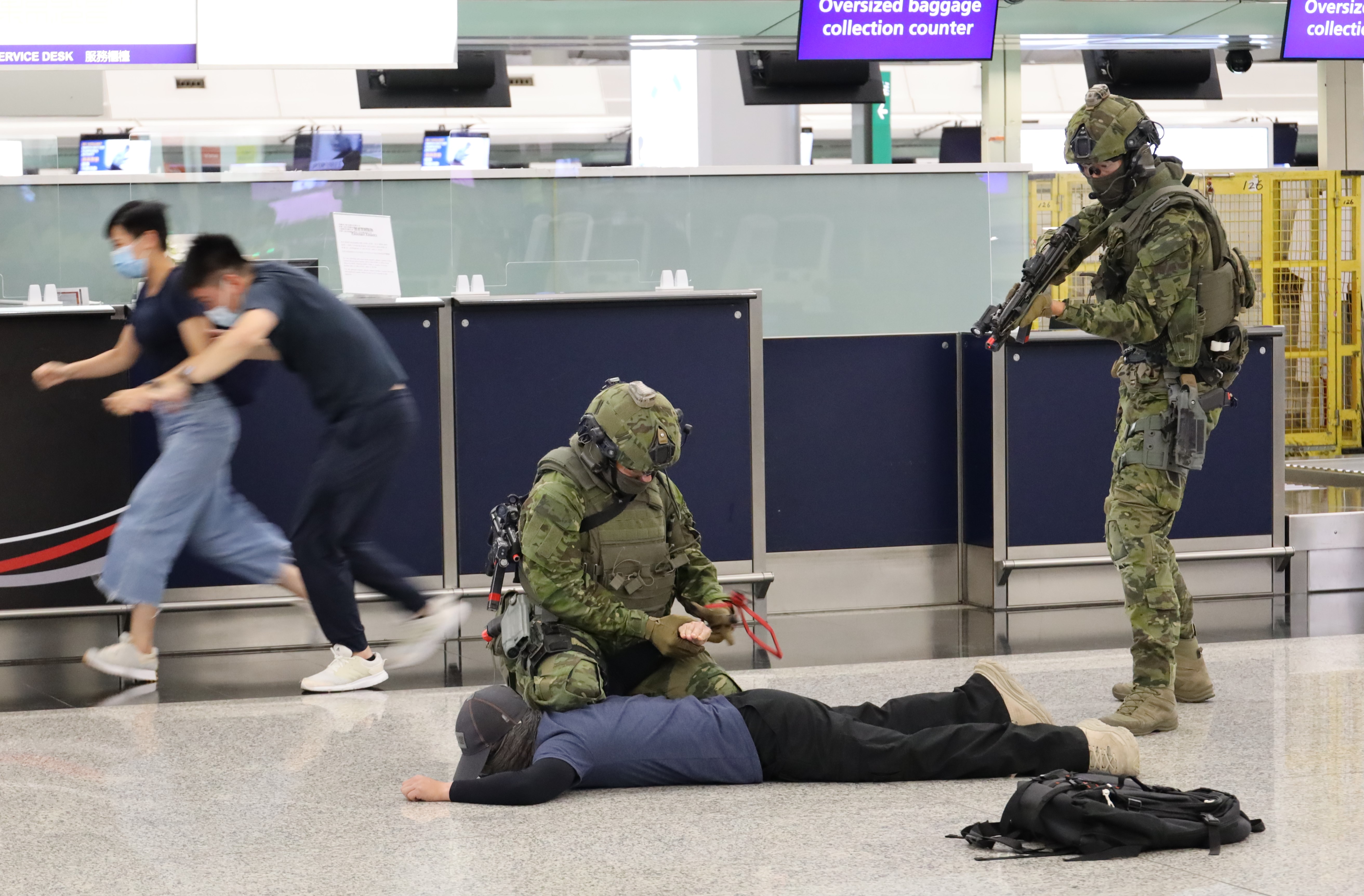 演習模擬恐怖團夥於客運大樓斬傷途人、脅持人質及企圖進行炸彈襲擊。圖:中通社