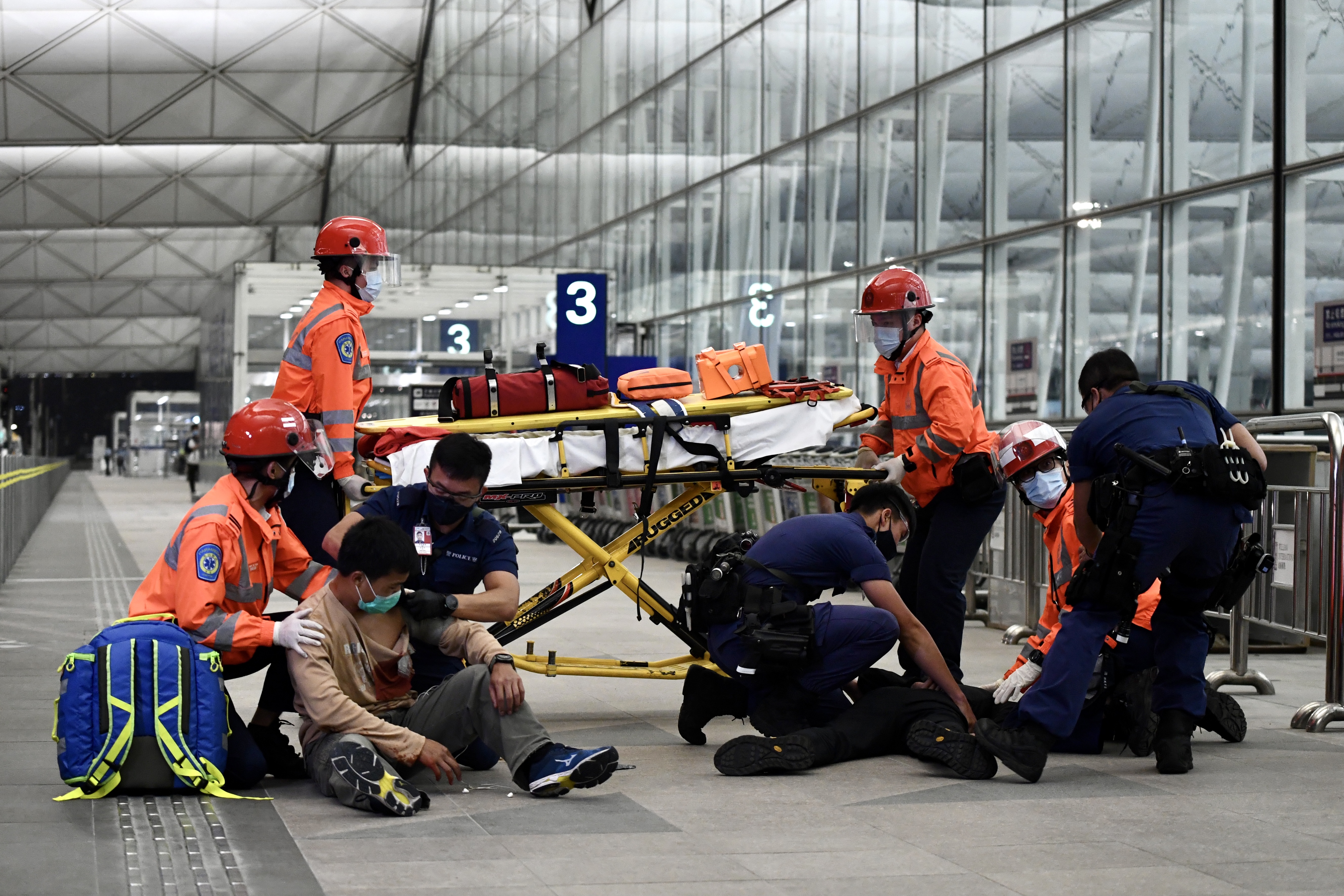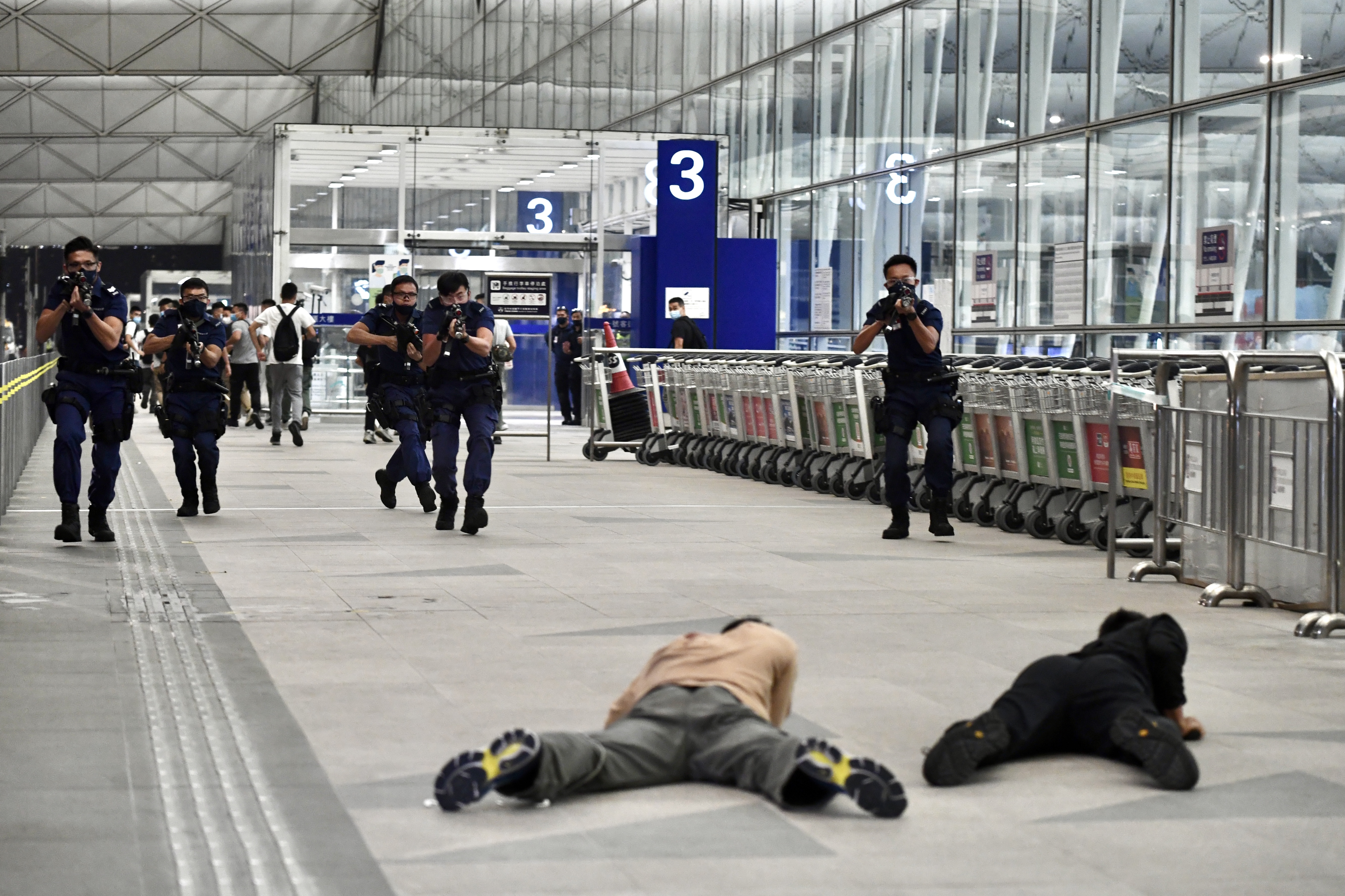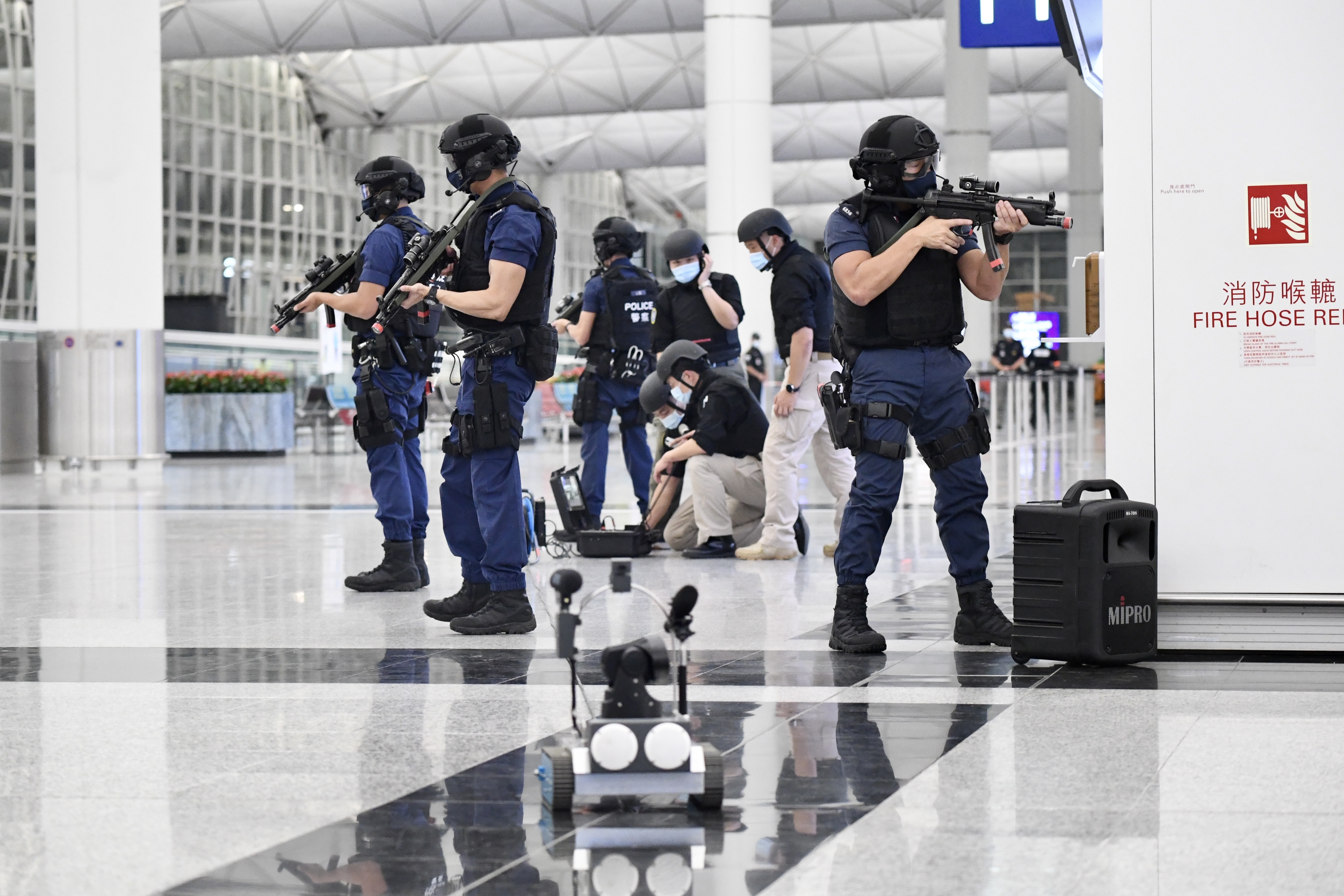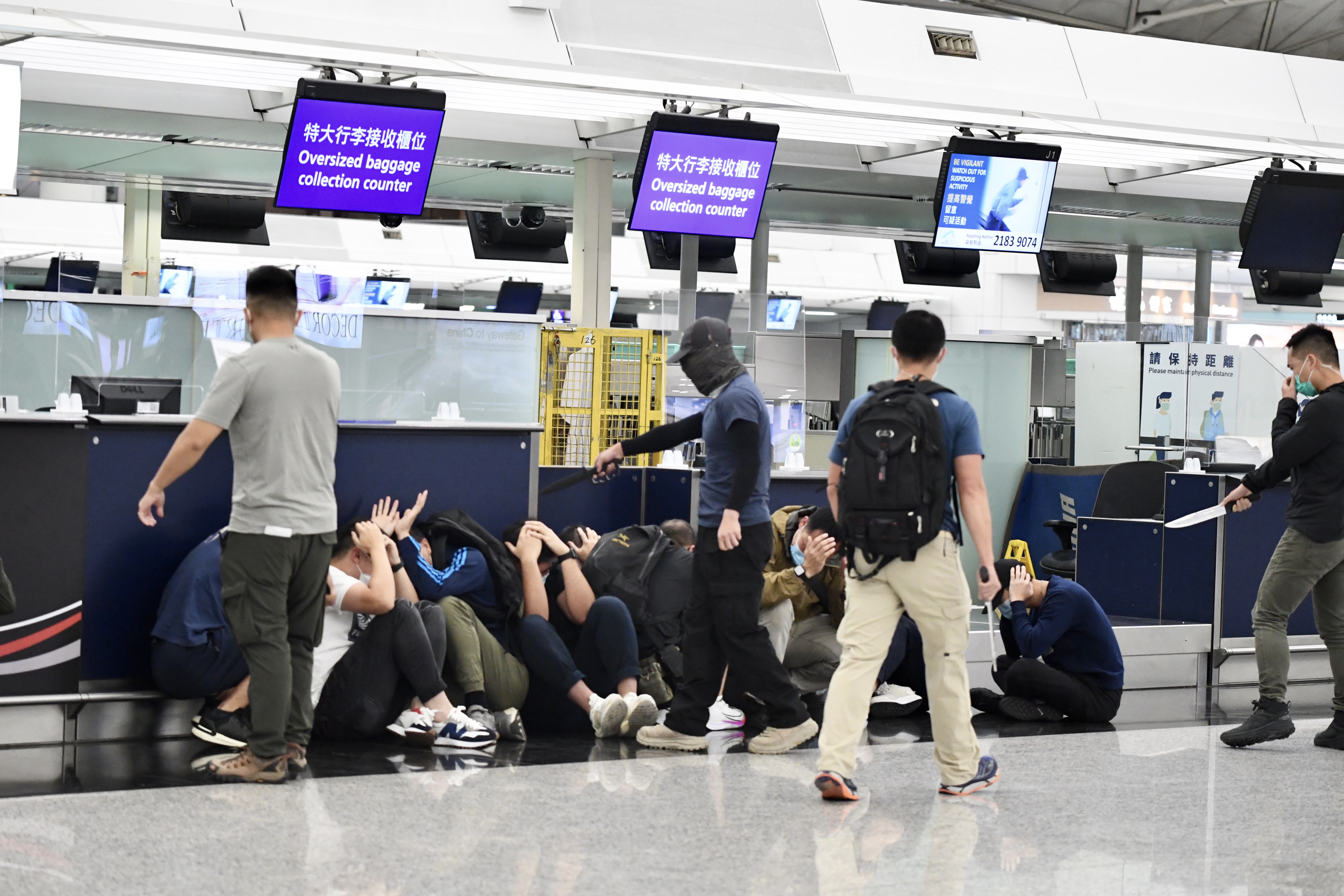 演習模擬恐怖團夥於客運大樓斬傷途人、脅持人質及企圖進行炸彈襲擊。圖:中通社