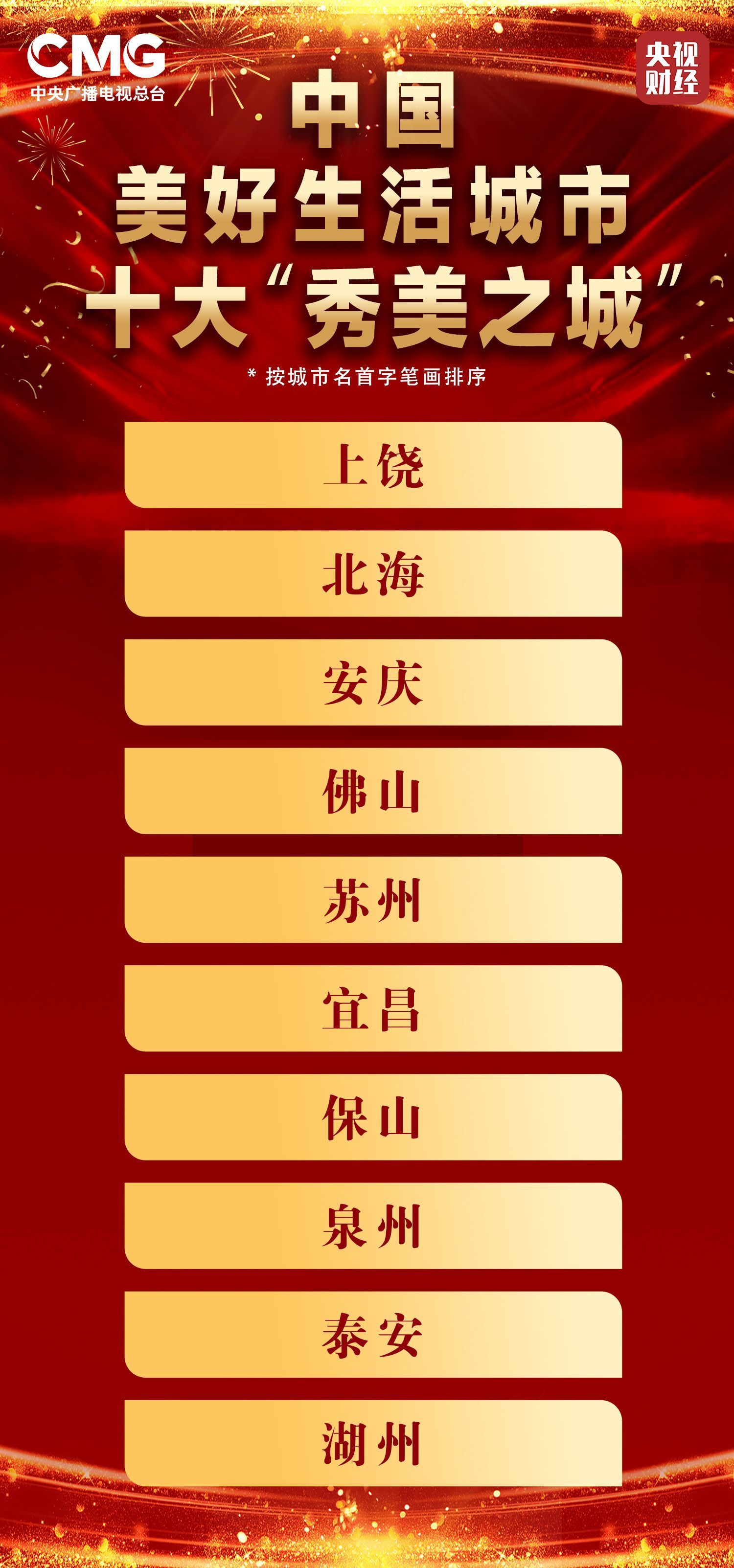 大連、上海、長沙、北京、成都、杭州、貴陽、海口、深圳、福州上榜十大「大美之城」(按照城市名首字筆畫排序);上饒、北海、安慶、佛山、蘇州、宜昌、保山、泉州、泰安、湖州上榜十大「秀美之城」。(按照城市名首字筆畫排序)