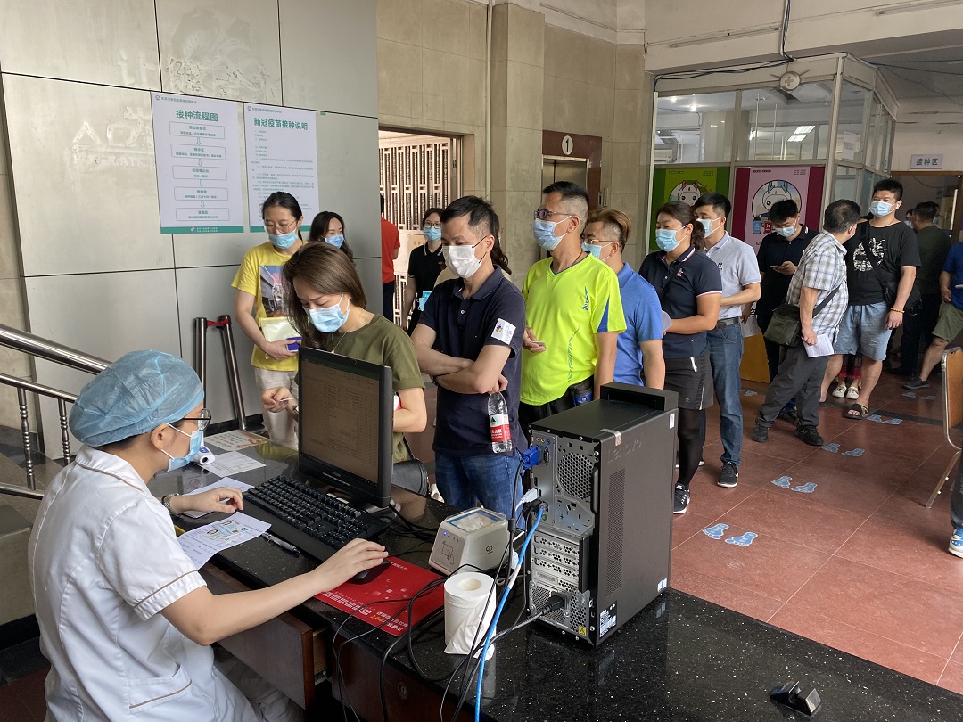 坐車、排隊、填表、簽字、接種,當天,60名港人乘坐東莞長安內地港人聯誼會安排的免費專車大巴,來到東莞市濱海灣中心醫院接種點,經過測量體溫、出示健康碼、身份核對、填寫知情同意書及醫生診斷身體情況後,順利完成了疫苗接種。
