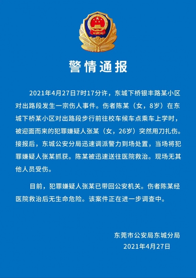 據東莞市東城街道公安分局通報:受傷者為一名8歲的陳姓女學生,犯罪嫌疑人張某(女,26歲)被當場抓獲,傷者經救治後無生命危險。