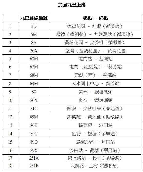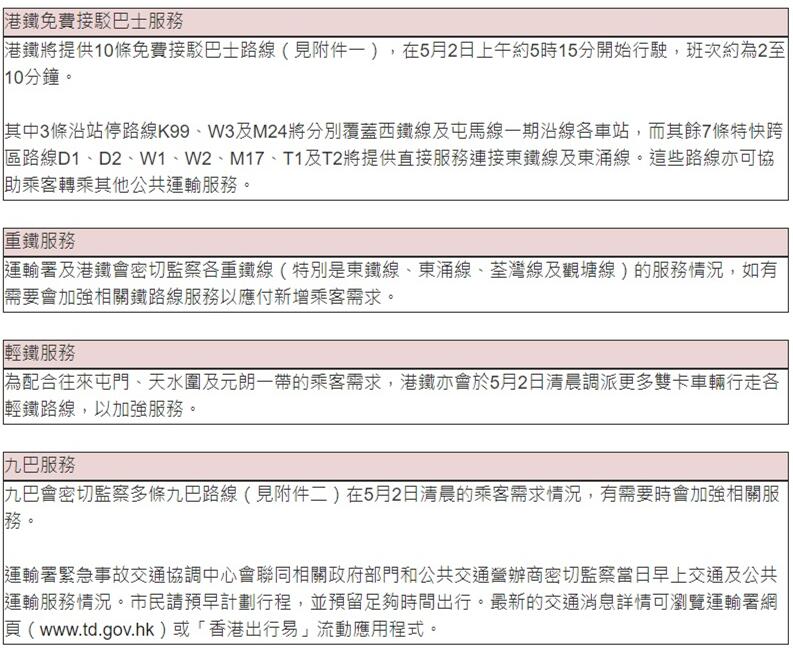 為應付有關地區市民的乘車需求,運輸署已協調港鐵及九巴,在5月2日清晨安排特別運輸服務,詳情如下: