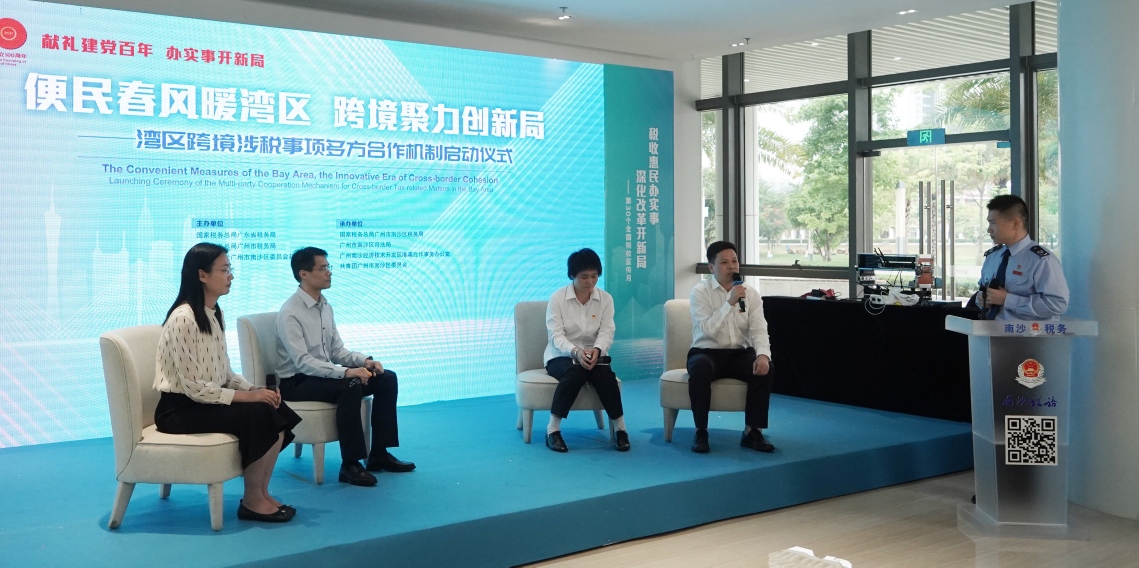 4月28日,由國家稅務總局廣東省稅務局、國家稅務總局廣州市稅務局、南沙區委政法委主辦,國家稅務總局廣州市南沙區稅務局聯合區司法局、區港澳辦、團區委承辦的「便民春風暖灣區 跨境聚力創新局—灣區跨境涉稅事項多方合作機制啟動儀式」在廣州市南沙水岸廣場舉行。啟動儀式上,稅務部門舉行了灣區跨境涉稅事項合作示範先鋒工作室掛牌儀式和灣區跨境涉稅事項合作示範先鋒隊授旗儀式,正式發布了灣區跨境涉稅事項多方合作機制,同時還發布推介了首批灣區跨境稅收服務標準和灣區跨境涉稅事項早期中立評估機制。