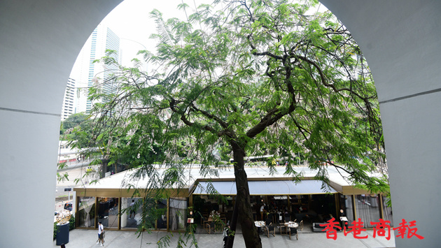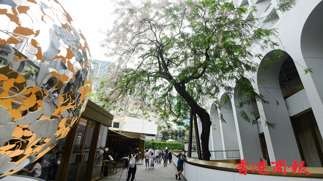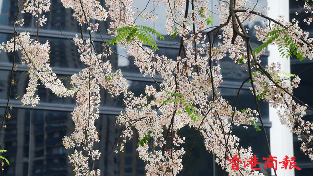 節果決明是喬木,又名粉花山扁豆,通常在初夏開花。這棵樹自2004年躋身香港「古樹名木」。當美利酒店前身、為政府主要部門辦公室的美利大廈,於2012年納入保育中環項目時,時任發展局長的林鄭月娥力排眾議,要保存這棵古樹,更由發展局找來樹木專家隊伍治理,古樹終可健康燦爛成長至今,也成這保育項目地標之一。節果決明的美麗不遜櫻花,也為這處帶來不少生氣。(記者崔俊良攝)