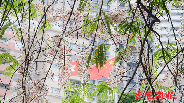 串串粉紅蕾、白瓣花托,形成連綿不絕的一串串花蕊,那種美態確令人神往。今天是五一勞動節假期,更吸引大批市民專程前往朝聖。連當年親自力保這棵節果決明的特首林鄭月娥,日前在立法會答問大會後,也親自到美利酒店一睹這棵節果決明樹最新美態。