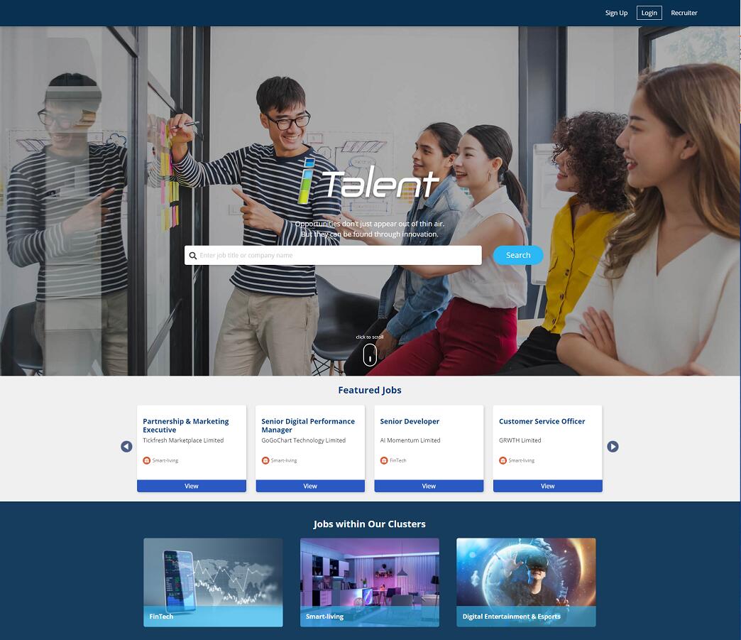 數碼港推出「iTalent」創科人才招聘平台,為一眾應屆大專畢業生與有志投身創科行業之求職者提供如數據工程師、全端工程師及人工智能研究等就業機會。