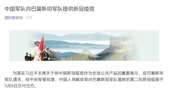 國防部網站今日發布消息稱,為落實習近平主席關於將中國新冠疫苗作為全球公共產品的重要宣示,應巴基斯坦軍隊請求,經中央軍委批准,中國人民解放軍向巴基斯坦軍隊援助的第二批新冠疫苗於5月6日交付巴方。