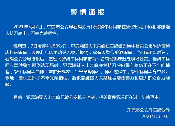 5月7日,廣東東莞市公安局石碣分局發布《警情通報》稱,5月7日,東莞市公安局石碣分局民警黎偉標同志在處警過程中遭犯罪嫌疑人持刀襲擊,不幸光榮犧牲。