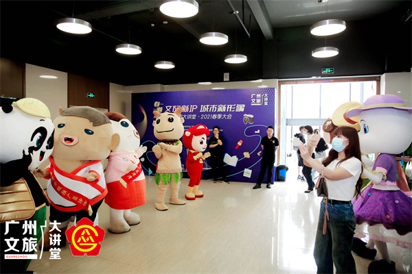 2021年5月7日下午,在廣州旅遊形象IP“阿蠻”和“咩仔”牽引,正佳極低海洋世界的白鯨愛麗絲、白鯨小五,正佳雨林的紅眼樹蛙、浣熊,廣州長隆的熊貓三寶萌萌、酷酷和帥帥,沙灣古鎮的沙沙、灣灣,廣之旅的小易,神農草堂中醫藥博物館的小神農,詠聲動漫的豬豬俠,郁文文化的文文,廣州琶醍的琶趣Patrik(男),醍樂Tilok(女),康萊德酒店的康萊Duck等可愛生動的形象IP吉祥物下齊聚一堂,動感的吉祥物寶寶們以歡快活潑的舞蹈向綫上、綫下的參會人員展示自己的才藝,也表達廣州文旅業界對遊客的歡迎。