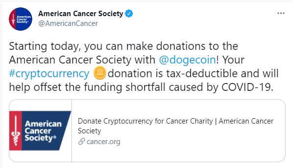 ACS在社交媒體寫道:「從今天開始,你可以用狗狗幣向我們捐款,你的加密貨幣捐款可以減稅,並將幫助抵消新冠疫情造成的資金短缺。」