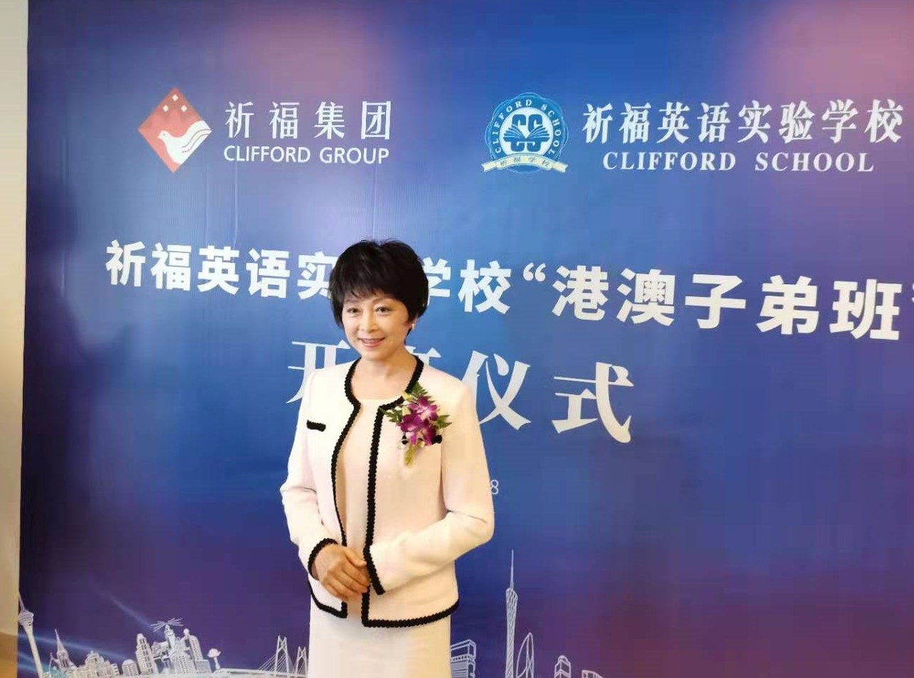 5月8日下午,位於廣州番禺區的祈福英語實驗學校舉行了「港澳子弟班」成立儀式。中央人民政府駐香港特別行政區聯絡辦公室、中央人民政府駐澳門特別行政區聯絡辦公室、廣州市教育局、廣州市統戰部、廣州市港澳辦、大灣辦、番禺區教育局等相關部門負責人、祈福集團副董事長孟麗紅(下圖)、數百名港澳台師生及家長參加了儀式。