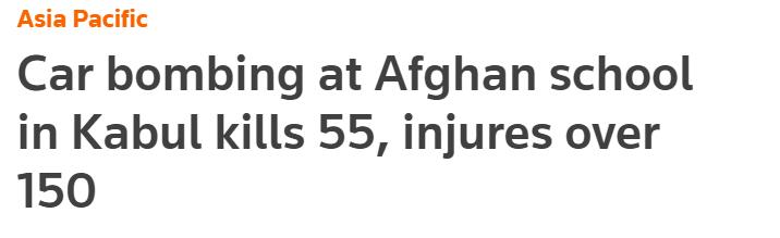 【04:00】香港时间5月9日凌晨4时,據路透社援引阿富汗安全部門官員消息:喀布爾學校爆炸已導致55人死亡,150人受傷。爆炸是由汽車炸彈和迫擊炮引起的。