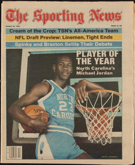 喬丹在大學時期效力於北卡羅來納大學,他曾穿着上图的藍白色23號球衣,登上1983年3月的The Sporting News刊物封面。當時,他獲選為美國大學體育協會(NCAA)年度最佳球員。