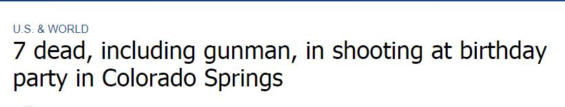 綜合美媒消息,當地時間星期日,美國科羅拉多州發生槍擊案,包括槍手在內共7人死亡。一名男子在科羅拉多斯普林斯市一個生日派對中,開槍射殺包括女朋友在內的6人,之後吞槍自盡。