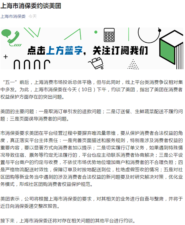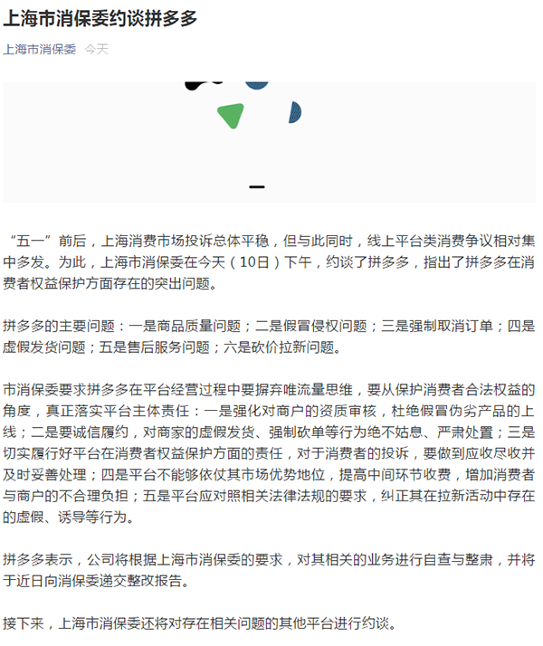 據上海市消保委微信公眾號消息,5月10日,上海市消保委約談了拼多多和美團,指出了拼多多和美團在消費者權益保護方面存在的突出問題。