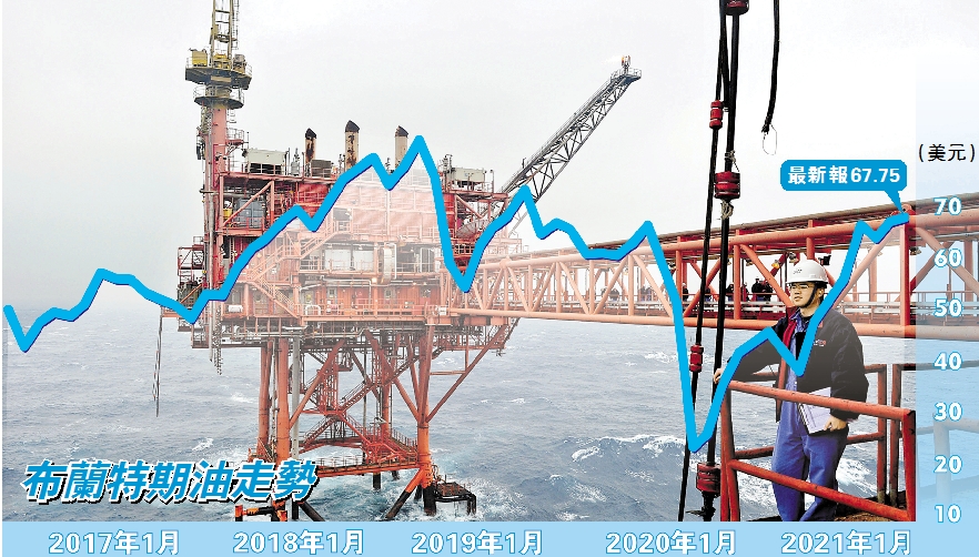 就油價走勢,市場普遍認為,油價向上機率大。高盛最新報告指出,由於疫情限制措施鬆綁,加上美元走弱,預計6個月內大宗商品價格將再升13.5%;其中,布蘭特期油價格料升至每桶80美元,美國原油價格有望升至每桶77美元,潛在升幅近30%。