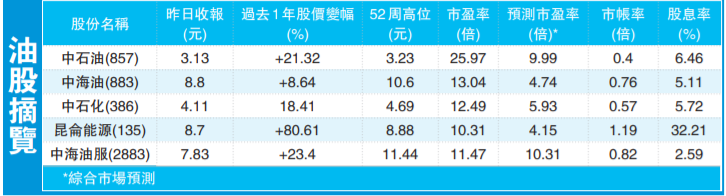 葉尚志續稱,個人看好中石油。中石油除了受惠於油價上升外,其業務重整,加上有天然氣等新能源,業務多元化,因此看好中石油的投資前景,建議可考慮於3.2元以下逐步買入,目標價3.5元。