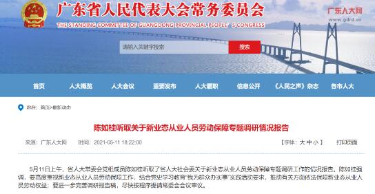 據廣東省人大常委會網站消息,5月11日上午,廣東省人大常委會黨組成員陳如桂聽取了省人大社會委關於新業態從業人員勞動保障專題調研工作的情況報告。