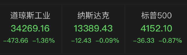 截至收盤,道指跌472.47點,報34270.35點,跌幅為1.36%;納指跌12.43點,報13389.43點,跌幅為0.09%;標普500指數跌36.34點,報4152.09點,跌幅為0.87%。