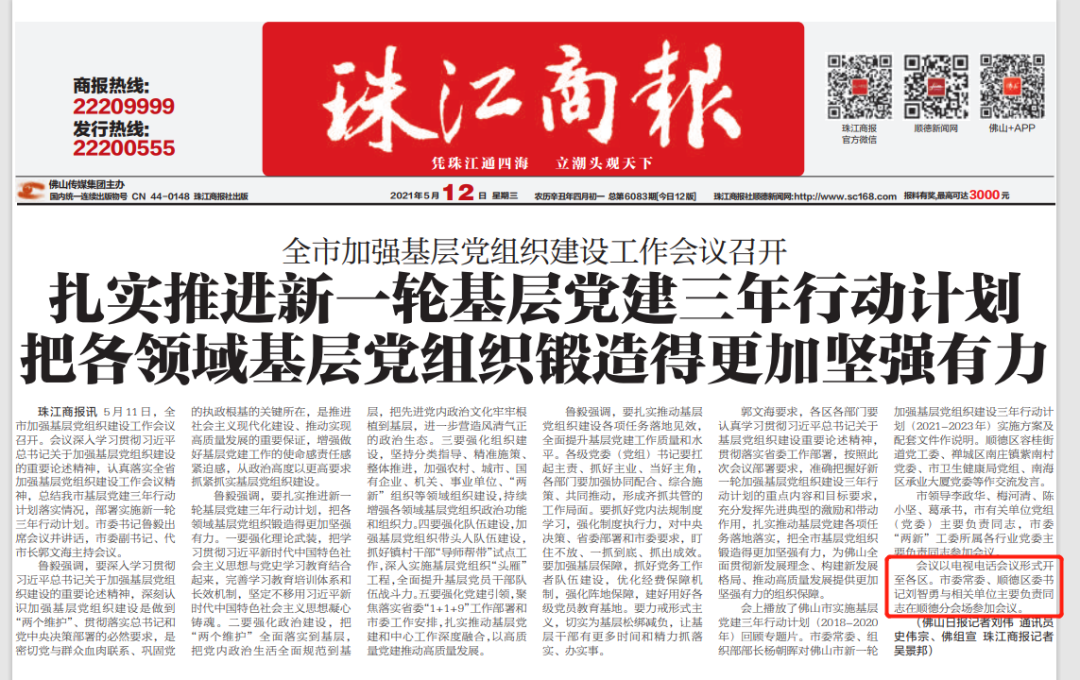 據珠江商報消息,5月11日,佛山市全市加強基層黨組織建設工作會議召開。會議以電視電話會議形式開至佛山市各區。佛山市委常委、順德區委書記劉智勇與相關單位主要負責同志在順德分會場參加會議。