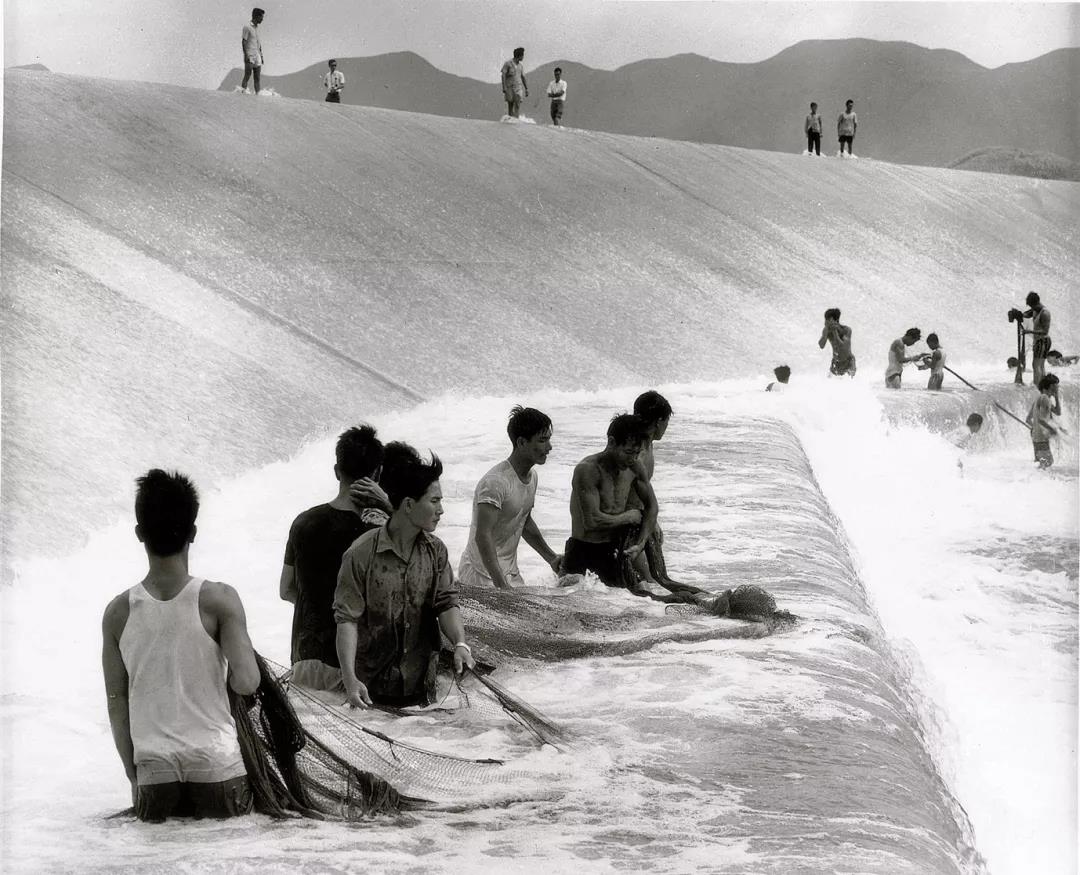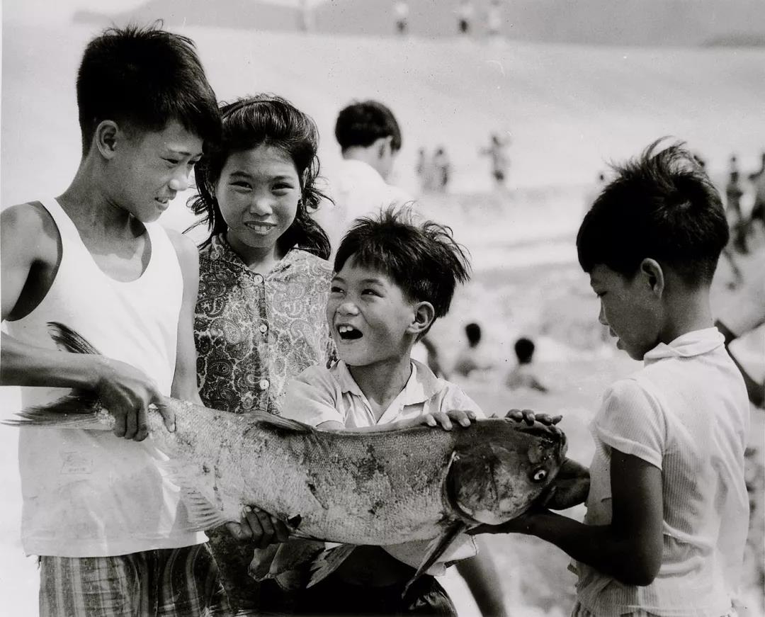 為了接收東江水,香港於上世紀60年代興建船灣淡水湖。圖為船灣淡水湖建成後,1969年8月第一次滿溢,市民於溢洪口嬉水、捕魚。
