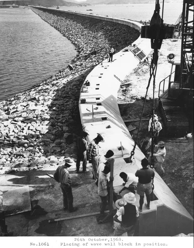 1968年,接收東江水的香港船灣淡水湖防浪牆施工場景。