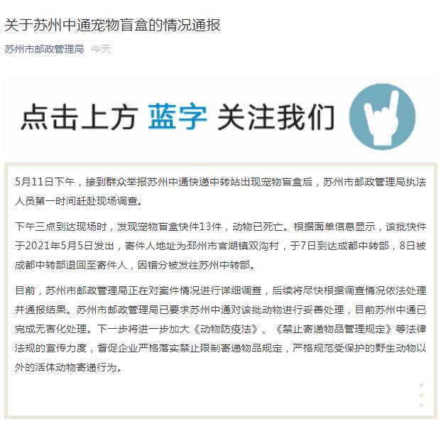 蘇州市郵政管理局12日在其官方微信發布關於蘇州中通寵物盲盒的情況通報,通報稱,發現寵物盲盒快件13件,動物已死亡,蘇州市郵政管理局已要求蘇州中通對該批動物進行妥善處理,目前蘇州中通已完成無害化處理。