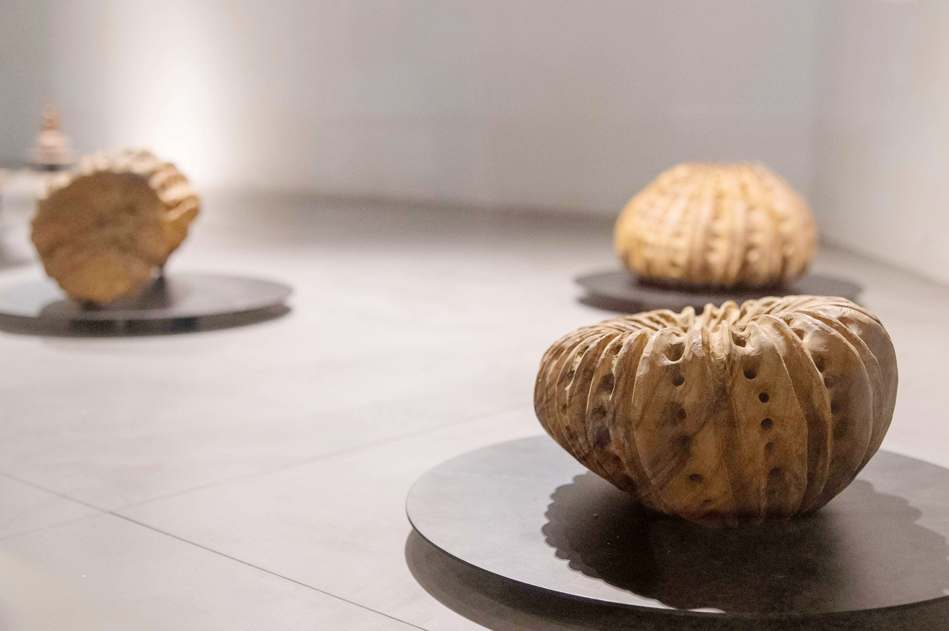 岑嘉慧在擱淺及飄浮的海洋生物啟發下創作木雕「殼」,以表達對家鄉之思念。