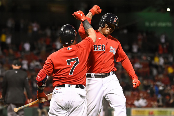 5月11日,美國馬薩諸塞州波士頓,波士頓紅襪隊的三壘手拉斐爾·德弗斯(11)在芬威球場第七局對奧克蘭運動家隊擊出一個本壘打後,與捕手克里斯蒂安·巴斯克斯(7)击肘慶祝。