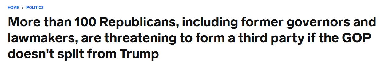 綜合美媒消息,逾百名共和黨人表示,若該黨不與美國前總統特朗普劃清界限,他們將離開共和黨並組建一個新的政黨。