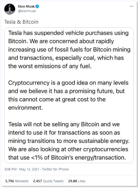 特斯拉CEO馬斯克(Elon Musk)周三在社交媒體上表示,出於「對比特幣挖礦和交易中使用化石燃料頻率迅速增加」的擔憂,特斯拉暫停使用比特幣來支付購車費用,正在考慮使用能源消耗更低的加密貨幣,但不會出售任何比特幣。
