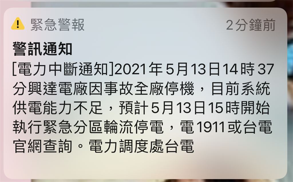 當地時間5月13日,位於高雄的興達火力發電廠發生機組跳電,台灣各地於下午三點時間開始實行輪流停電。