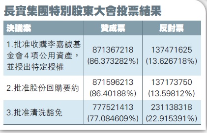 長實集團(1113)舉行特別股東大會,獲至少86%股東同意通過從李嘉誠基金會手上,以170億元收購4項公用資產、發行新股、股份回購及清洗豁免決議案。主席李澤鉅13日表示,交易有助穩定收入來源及現金流之餘,風險也較低,同時不用在外與其他公司「搶價」併購。