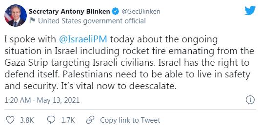 美國國務卿安東尼·布林肯(Antony Blinken)表示,美國將派負責以色列和巴勒斯坦事務的副國務卿海蒂·阿姆爾(Hady Amr)立即前往中東,敦促以色列和巴勒斯坦衝突降級。