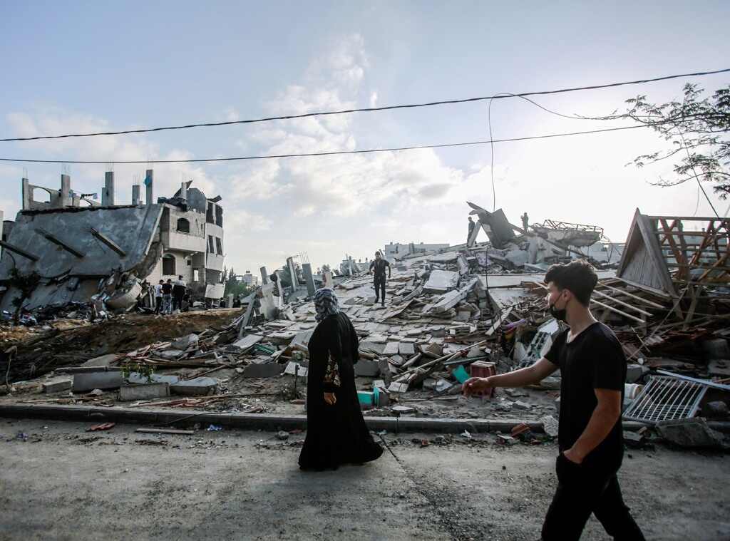 5月13日,巴勒斯坦人走在被以色列空襲摧毀的15層建築物的廢墟上。(圖源:美聯社)