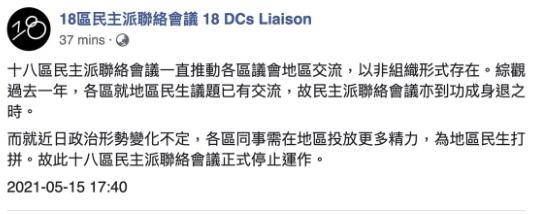 「18區民主派聯絡會議」稱,就因近日政治形勢變化,各區議員需要在地區投放更多精力,為地區民生打拼,故此「18區民主派聯絡會議」正式停止運作。