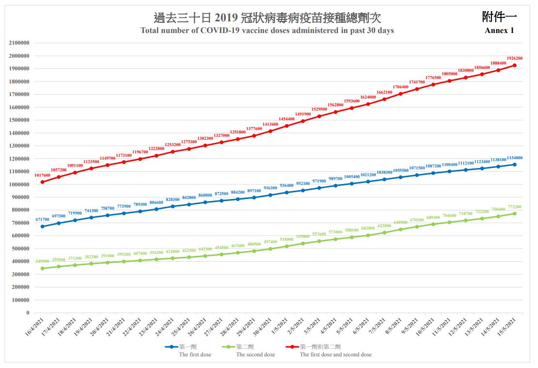 港府15日晚間公布,本港接種計劃開展以來,政府已為市民接種共約1926200劑2019冠狀病毒病疫苗。當中約1154000名市民已接種第一劑疫苗,包括約502000名接種科興疫苗,約652000名接種復必泰疫苗。約772200名市民已接種第二劑疫苗,包括約364000名接種科興疫苗,約408200名接種復必泰疫苗。