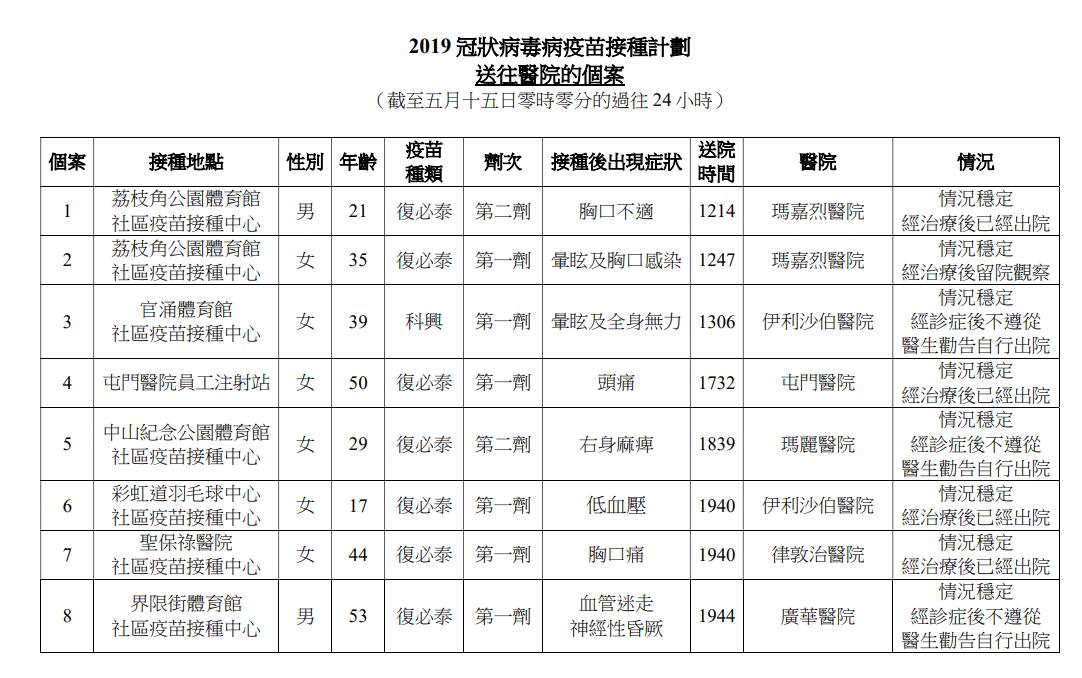 需要留院觀察的是一名35歲女子,她接種第一劑復必泰疫苗後出現暈眩及胸口感染,送往瑪嘉烈醫院治理,目前情況穩定。其他人士接種疫苗後不適的症狀包括暈眩及全身無力、頭痛、高血壓、心悸、胸口痛、半身麻痺等。