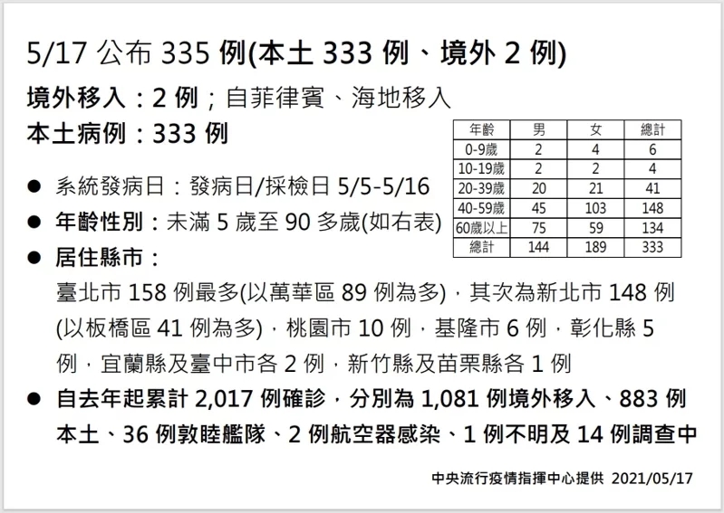 近日,台灣本土確診案例快速飆升,到昨天為止,新冠確診個案分別為1079例境外输入,550例本土病例。台灣今天(17日)新增333例本土病例,境外输入2例。台灣疫情指揮中心指揮官陳時中表示,新增個案中有144位男性,189位女性,年齡分布未滿5歲到90幾歲,最早發病日為5月5日。