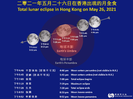 康文署其後提醒市民在觀賞天文現象時應遵守最新防疫措施和保持社交距離,並注意個人衛生;市民還可瀏覽展覽展覽網頁hk.space.museum/zh_TW/web/spm/exhibition/specialexhibition/2021-astronomical-events.html及香港太空館本期通訊hk.space.museum/documents/2178963/2179286/Newsletter2021_02r.pdf了解更多是次月全食的詳情。