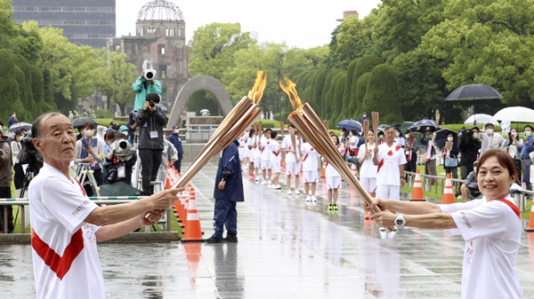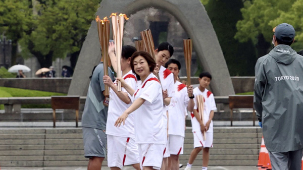 據新華社報道,東京奧運火炬周一開始在廣島傳遞,不過因為疫情形勢嚴峻,路上的傳遞被取消,所有火炬手聚集在公園內,閉門完成了傳遞。