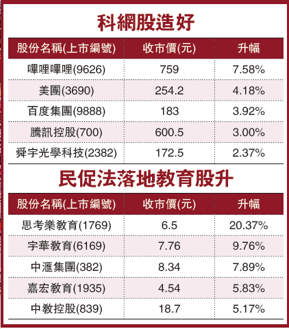 另外,國家教育部修訂教育促進法,教育股個別發展,睿見教育(6068)跌近10%,宇華教育(6169)升近10%,新東方在線(1797)及中教控股(839)升逾5%。(記者吳天淇)