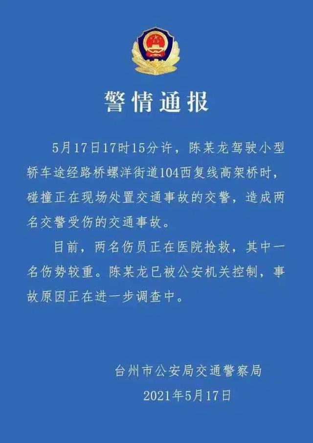 5月17日晚,台州交警發布通報稱,5月17日17時15分許,陳某龍駕駛小型轎車途經路橋螺洋街道104西複線高架橋時,碰撞正在現場處置交通事故的交警,造成兩名交警受傷的交通事故。